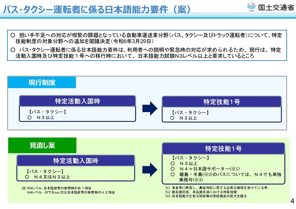 制度概要資料では、トラックはN4相当(JLPT N4または日本語基礎テスト合格)が基本ラインとして示され、タクシー・バスはN3が示されています。また、緊急時対応があるため、より高い日本語水準が求められる設計です。